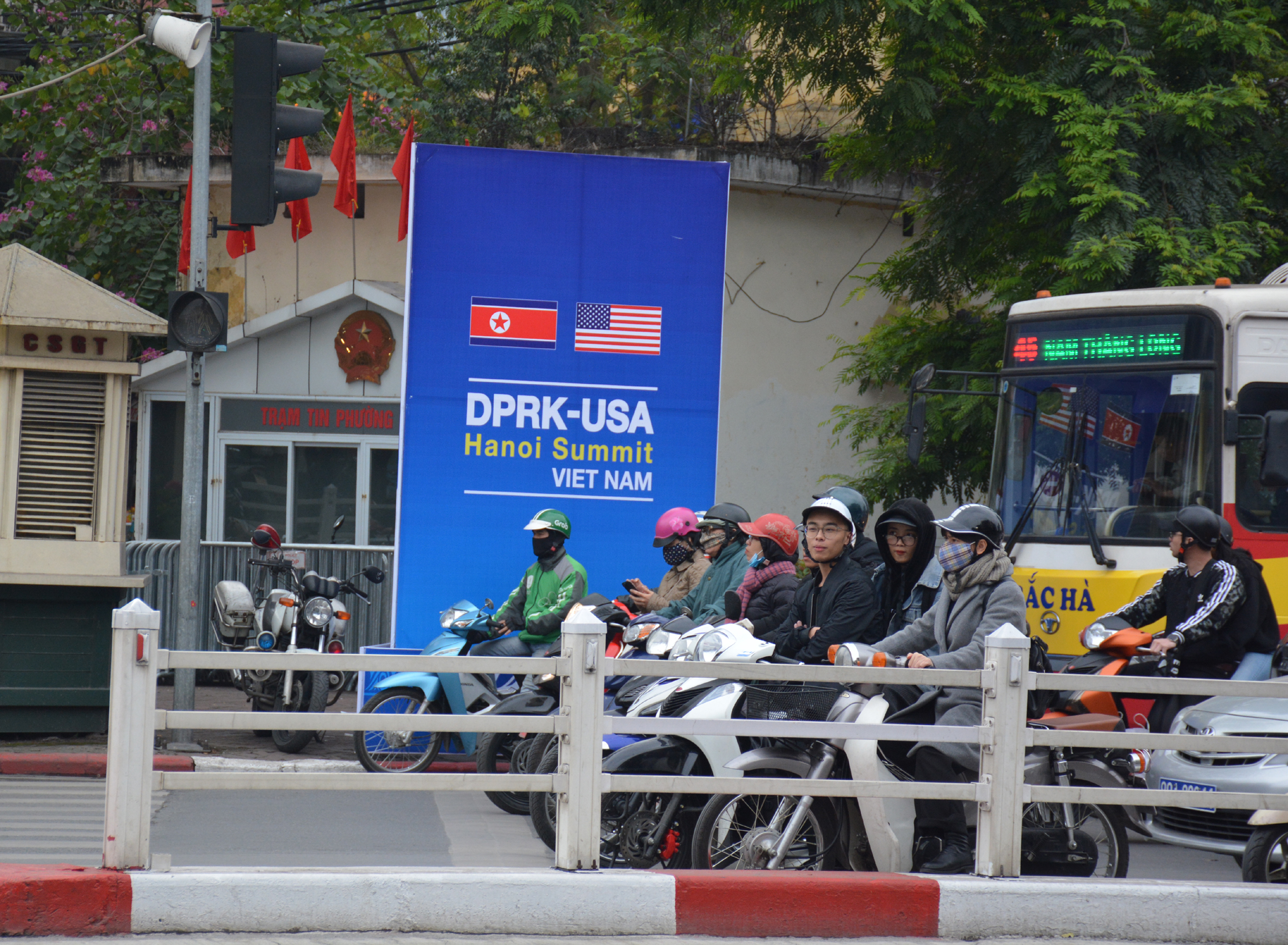 Hầu hết các con phố của Hà Nội đều được trang hoàng bằng băng rôn, cờ hoa và Quốc kỳ 3 nước: Việt Nam, Mỹ, Triều Tiên.