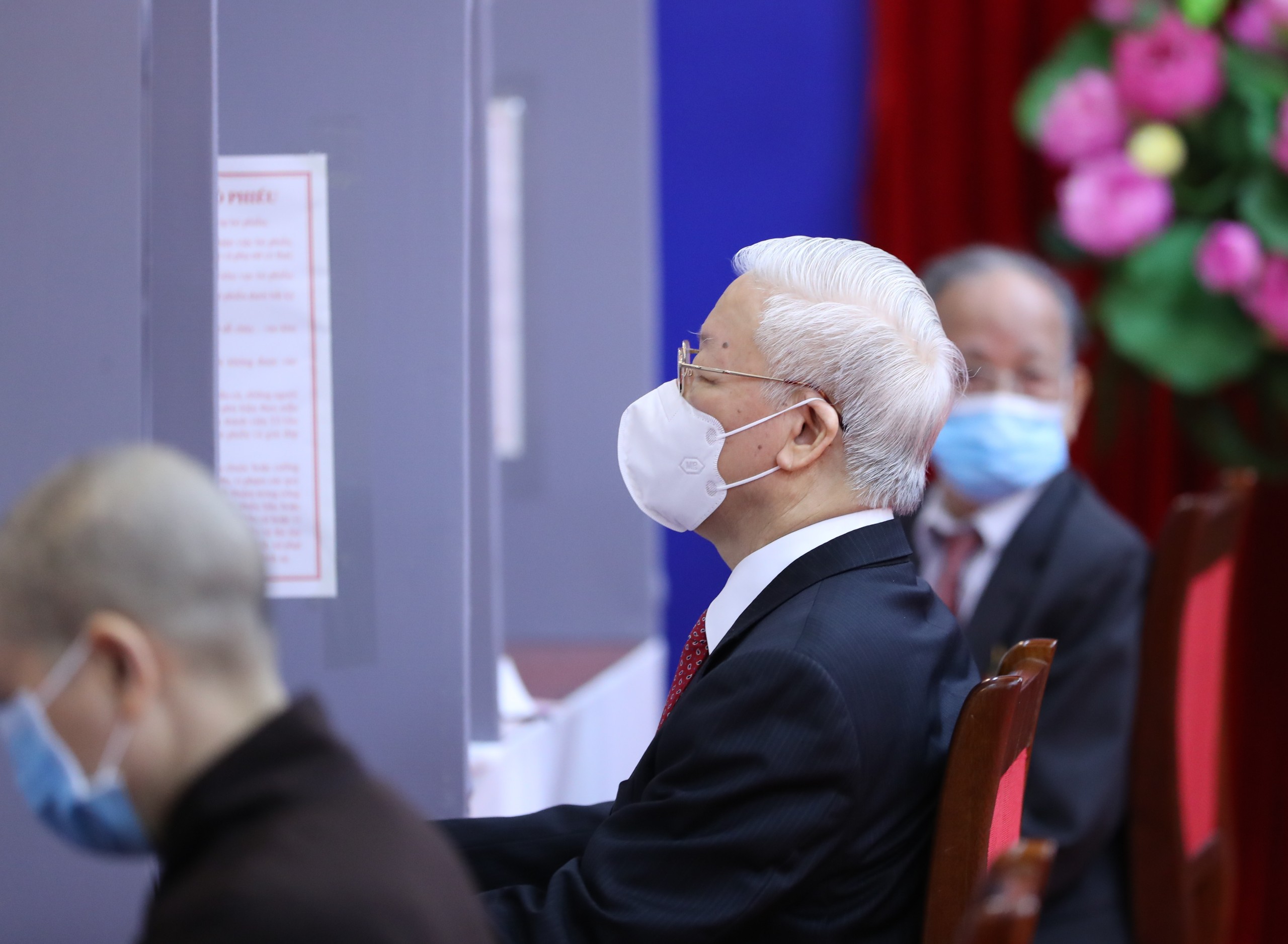 Tổng Bí thư Nguyễn Phú Trọng bỏ lá phiếu đầu tiên tại khu vực bỏ phiếu số 4, phường Nguyễn Du, quận Hai Bà Trưng, thành phố Hà Nội. Ảnh: Trọng Hải