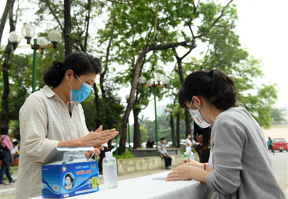 Người dân nghèo đến nhận gạo được hướng dẫn xếp hàng giãn cách từ ngoài cổng, và rửa tay sát khuẩn tại bàn đón tiếp và nhắc nhở đeo khẩu trang đúng cách.