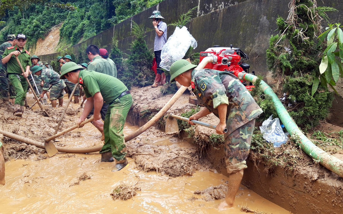 Cán bộ, chiến sĩ lực lượng vũ trang huyện Mai Sơn đã kịp thời có mặt tham gia dọn bùn đất.