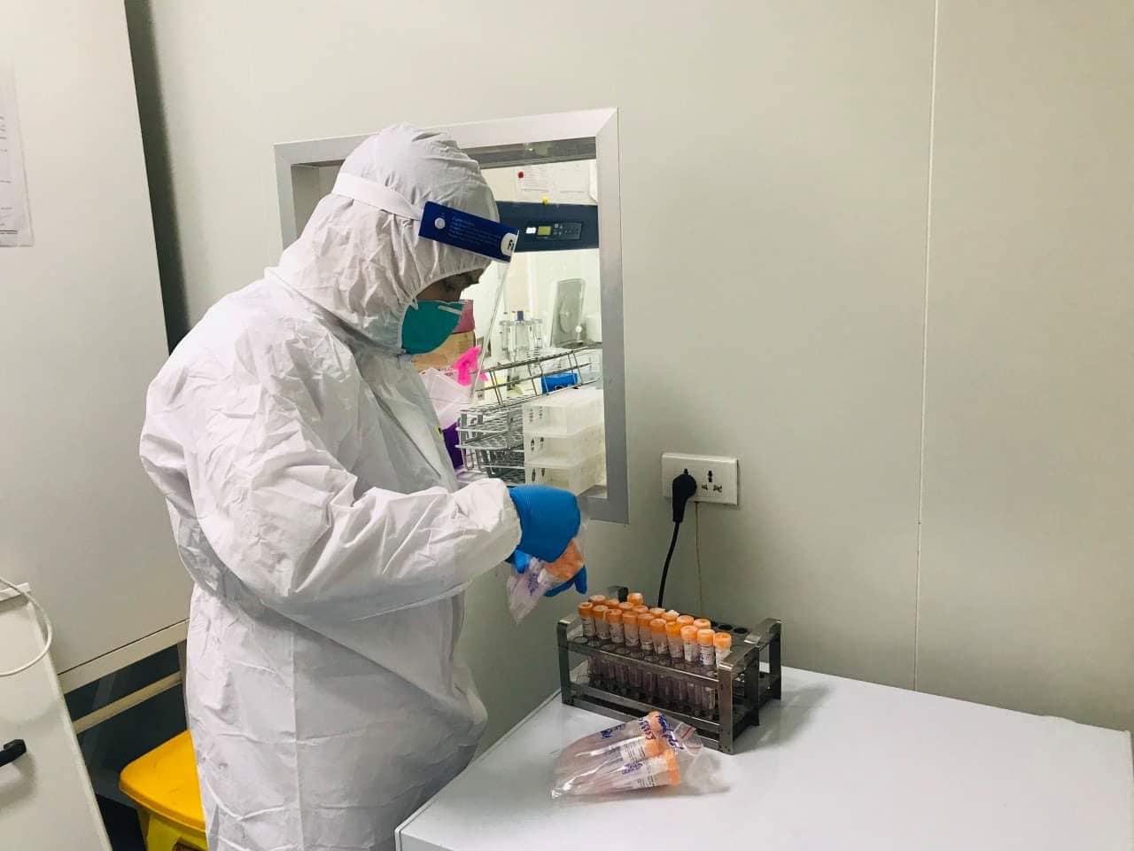 Sau khi các cán bộ y tế lấy mẫu xong, các mẫu xét nghiệm được đưa vào thùng bảo quản.