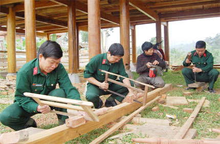 Cán bộ, nhân viên Đội xây dựng cơ sở số 6 (Ban CHQS Quế Phong) giúp dân dựng lại nhà ở khu tái định cư bản Huôi Su - Huôi Lạn, xã Tiền Phong, Quế Phong.
