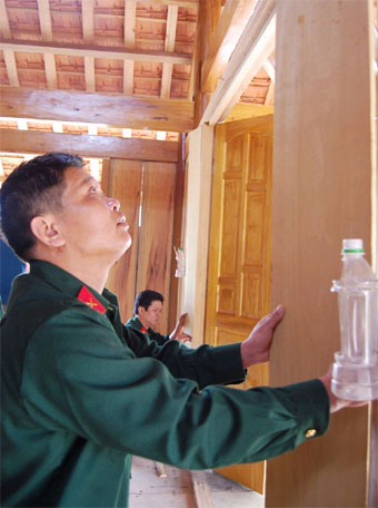 Cán bộ, nhân viên Đội xây dựng cơ sở số 6 (Ban CHQS Quế Phong) giúp dân dựng lại nhà ở khu tái định cư bản Piềng Cu, xã Tiền Phong, Quế Phong.