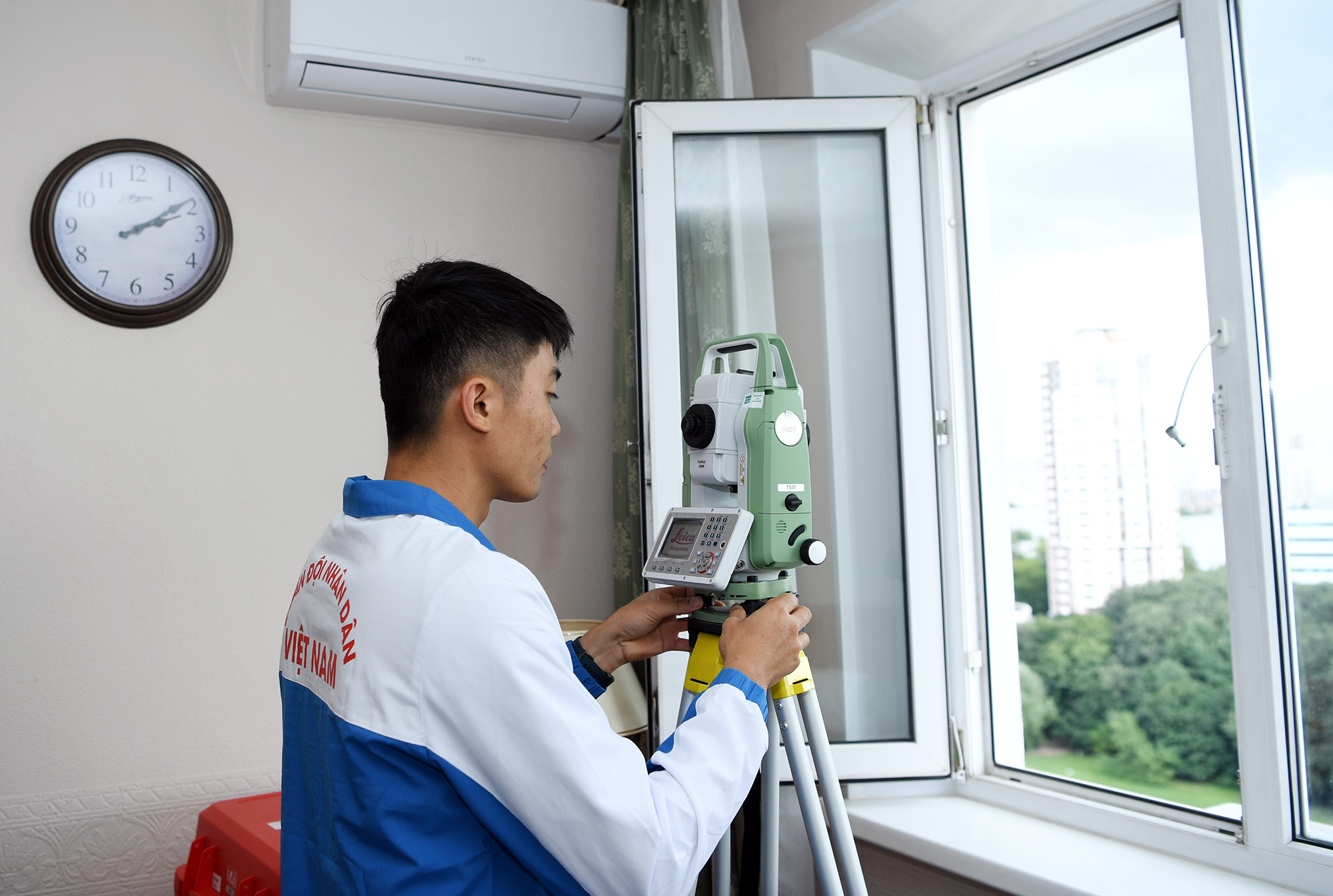 Thành viên đội tuyển Kinh tuyến tranh thủ luyện tập nâng cao chuyên môn tại phòng trên máy toàn đạc.