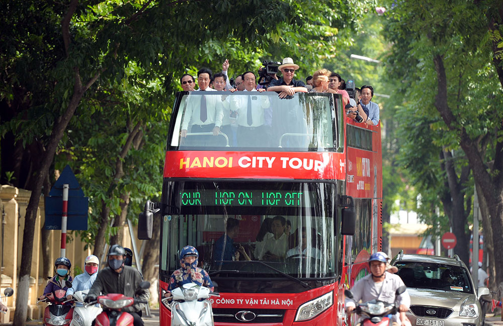 Tham quan Hà Nội bằng xe bus mui trần hai tầng cũng tạo nên cảm giác thú vị cho du khách.