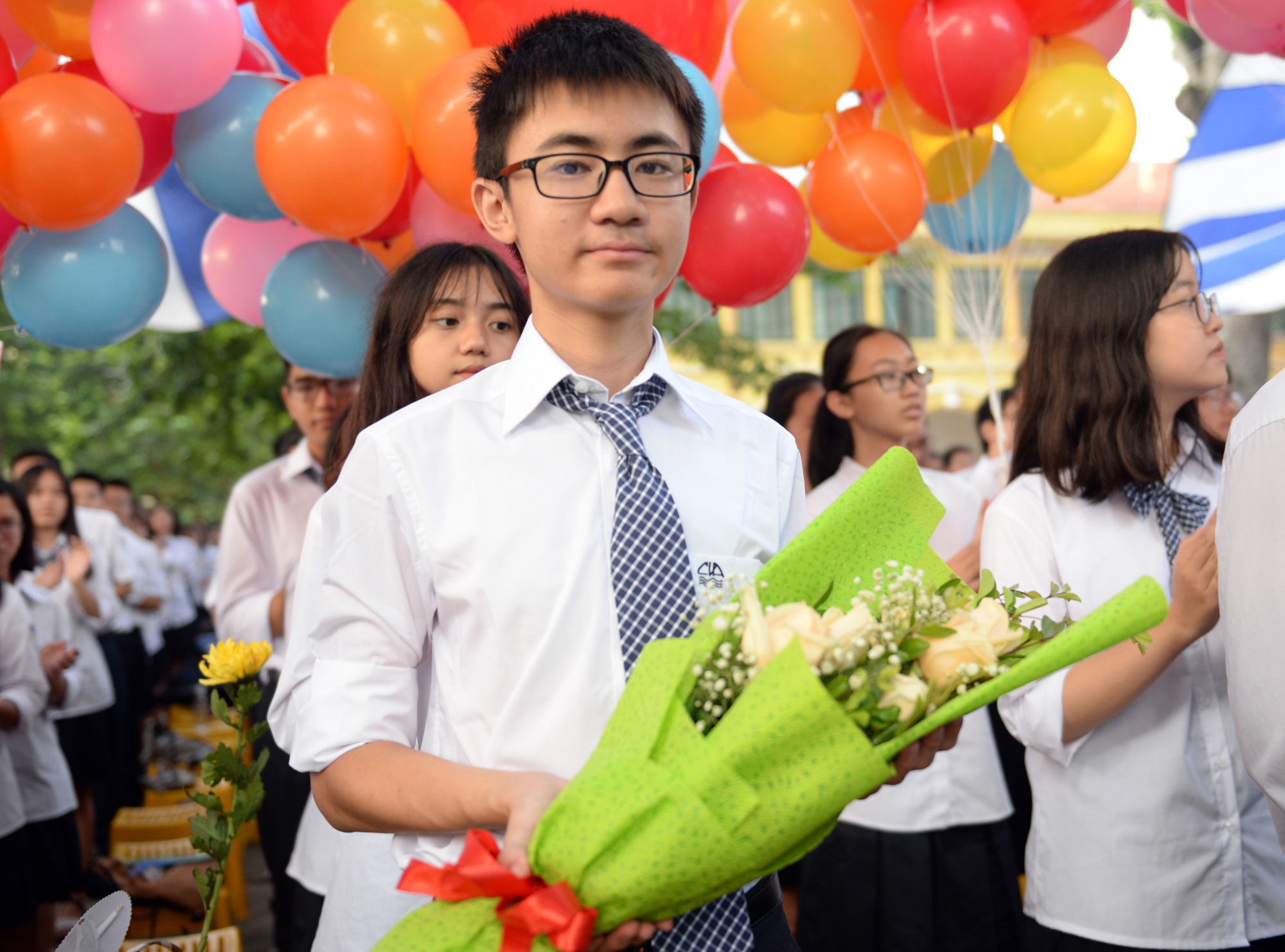 Học sinh trường THPT Chuyên Phan Bội Châu (Nghệ An) trong ngày khai trường.