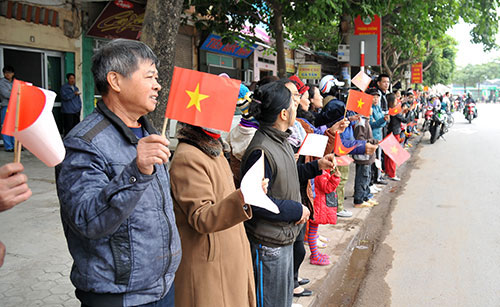 Nhiều người dân mang cờ Tổ quốc ra vẫy chào đoàn đua.