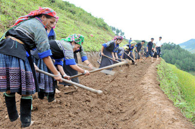 Đồng bào Mông trình diễn kỹ thuật làm ruộng bậc thang