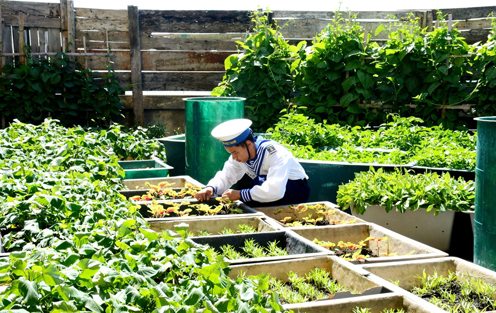 QĐND Online - Giữa trùng khơi, quanh năm chỉ có nắng và gió biển mặn chát, nhưng cán bộ, chiến sĩ trên quần đảo Trường Sa, huyện Trường Sa (tỉnh Khánh Hòa) luôn chủ động khắc phục khó khăn, tích cực tổ chức tăng gia, chăn nuôi, góp phần cải thiện, nâng cao đời sống. Trong điều kiện thời tiết khắc nghiệt, để vườn rau được xanh tốt, giàn bầu, bí sai trĩu quả, đàn lợn, gia cầm béo khỏe, cán bộ, chiến sĩ trên các đảo đã có những cách làm sáng tạo, cùng nhiều biện pháp chăm sóc đặc biệt như: Căng bạt, căng lưới che chắn cẩn thận; tận dụng các khay, chậu để trồng rau; thường xuyên phơi đất, xới đất; ủ lá cây làm phân…Nhờ đó, hầu hết các đảo chìm, đảo nổi trên quần đảo Trường Sa đều bảo đảm được nguồn thực phẩm tại chỗ, nhất là rau xanh đưa vào bữa ăn hằng ngày cho bộ đội.