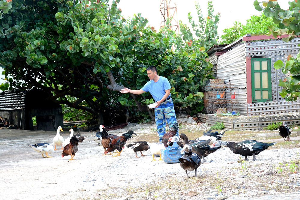 Bên cạnh những vườn rau xanh, cán bộ, chiến sĩ trên đảo Trường Sa còn nuôi thêm gia cầm để tạo nguồn thực phẩm tươi sống.