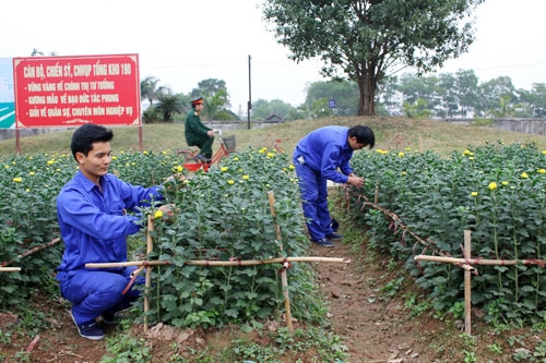 "Lính thợ" Phân kho 93, Tổng kho 190 (Cục Xăng dầu, Tổng cục Hậu cần) đưa hoa từ vườn về làm đẹp đơn vị trong dịp Tết Nguyên đán.