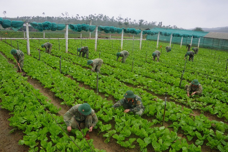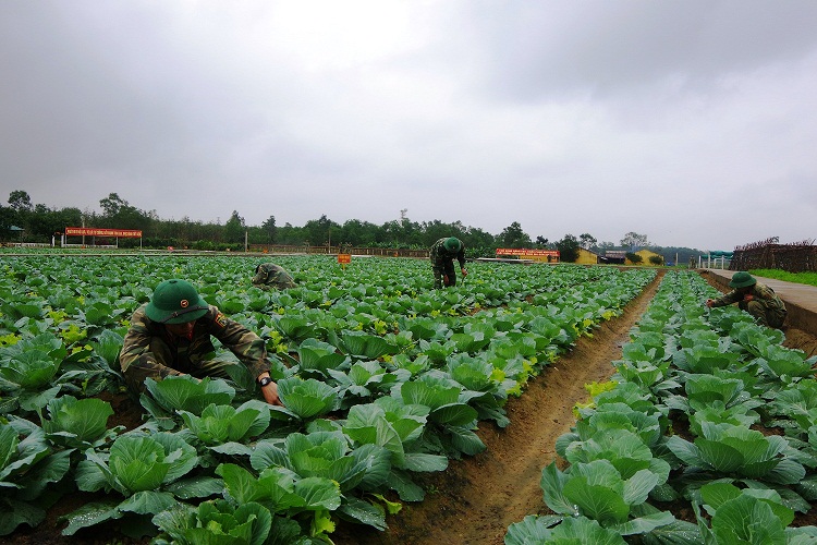 Cán bộ, chiến sĩ Tiểu đoàn 4, Trung đoàn 19 chăm sóc rau xanh bảo đảm nhu cầu thực phẩm cho chiến sĩ mới