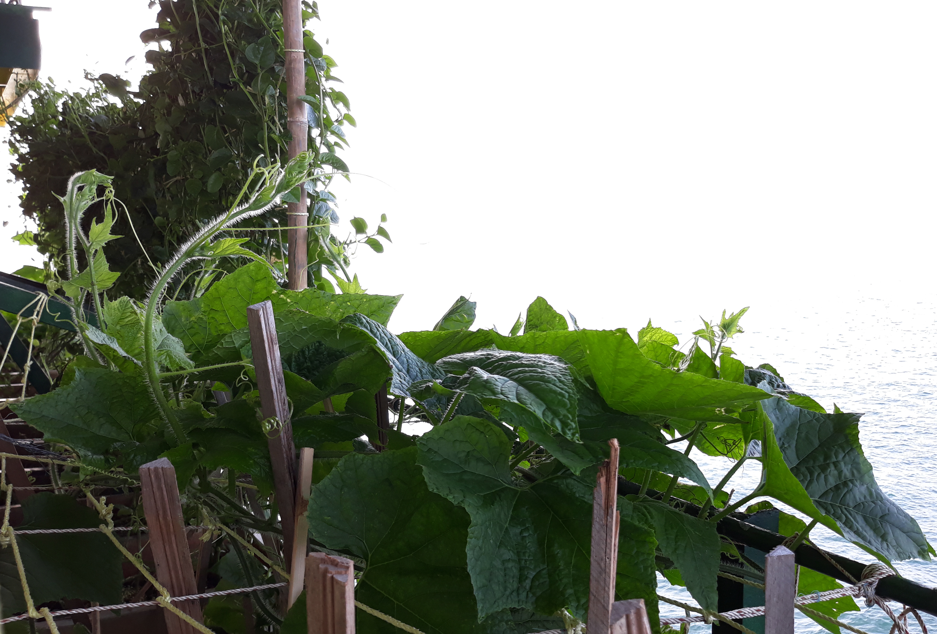 Cán bộ, chiến sĩ nhà giàn tận dụng những nơi có thể để đặt khay, thùng, chậu để trồng cây. Bất cứ vật liệu gì dù đó là gỗ, sắt hoặc tre được làm giàn vươn ra phía biển để tăng diện tích trồng rau.
