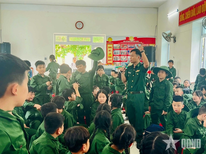 | Trung úy Lê Xuân Thiên hướng dẫn các cháu học sinh trải nghiệm "Một ngày làm chiến sĩ Biên phòng". |