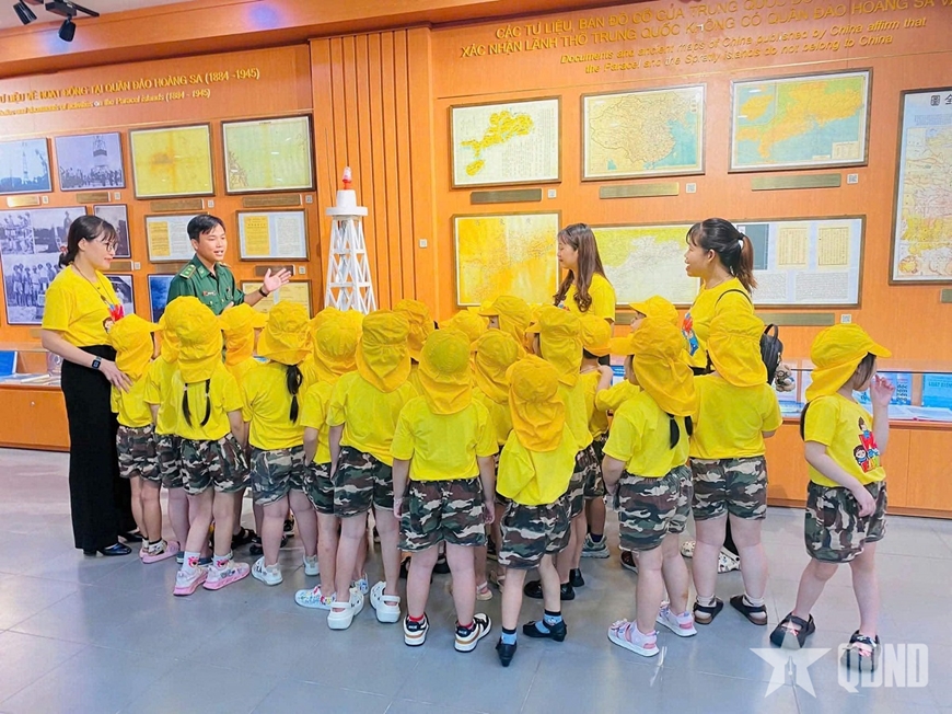 | Trung úy Lê Xuân Thiên hướng dẫn các cháu học sinh tham quan Nhà Trưng bày Hoàng Sa. |