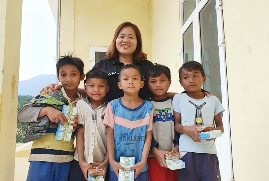 Chị Vũ Thị Thùy bên các em nhỏ trong một chuyến đi thiện nguyện tại huyện Hoàng Su Phì, tỉnh Hà Giang. Ảnh: NVCC