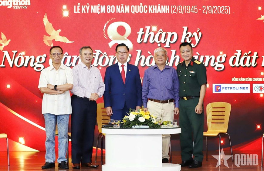 Doanh nhân Trần Mạnh Báo (đứng giữa) tại buổi Tọa đàm "8 thập kỷ nông dân đồng hành cùng đất nước", tháng 8-2025.