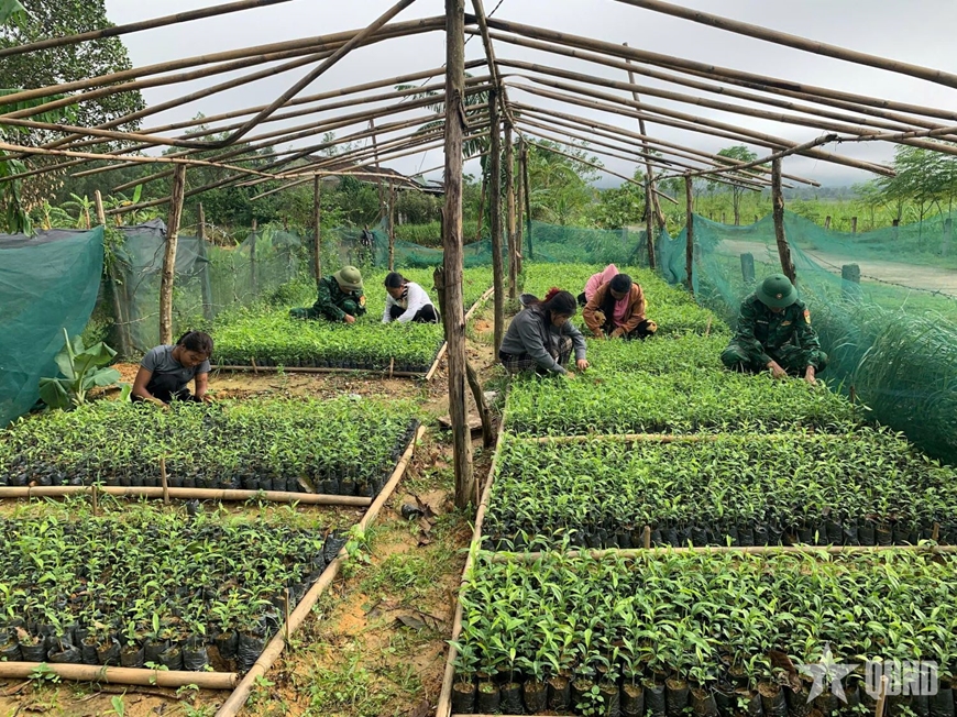 | Cán bộ Tổ công tác Biên phòng bản Rào Tre và nhân dân chăm sóc cây giống tại vườn ươm. |