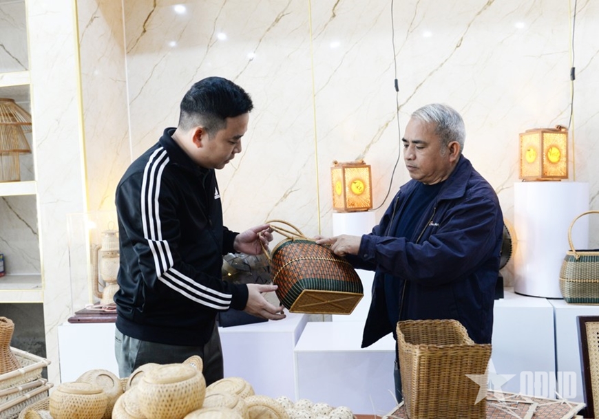 Nghệ nhân Nhân dân Nguyễn Văn Tĩnh (bên phải) giới thiệu các sản phẩm thủ công mỹ nghệ mây, tre đan.