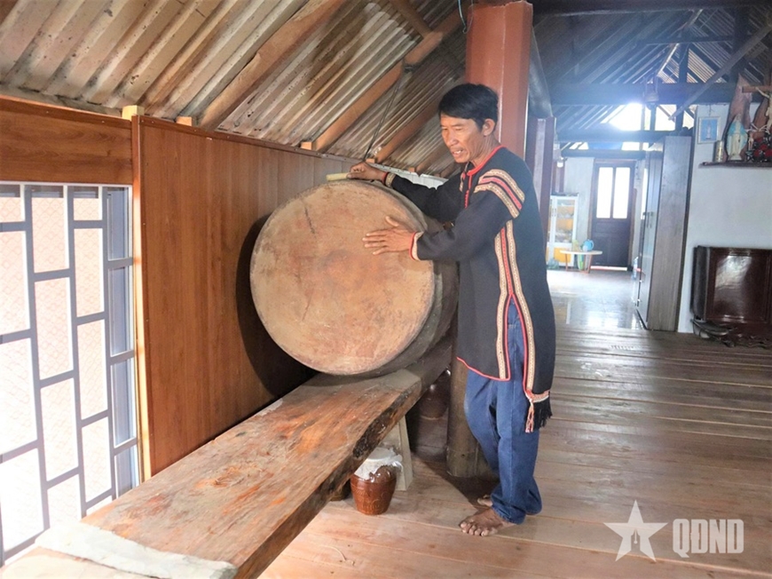 Nếu đàn đá như tiếng suối reo thì chiếc trống da trâu treo giữa nhà Ma Phúc chính là tiếng sấm rền vang vọng khắp buôn xa, làng gần. Chiếc trống khổng lồ, bạc màu thời gian là vật dụng mà ông đã gìn giữ hơn 40 năm qua. Ma Phúc vuốt ve mặt trống và kể, chiếc trống này có nguồn gốc từ vùng Đắk Phơi, nơi rừng đầu nguồn, nơi có những cây gỗ to, tròn và tốt nhất để làm tang trống. Người đồng bào ở đó đã hạ cây, đẽo gọt ròng rã nhiều tháng trời, rồi đợi khi mổ trâu, lấy nguyên tấm da trâu đực căng ra làm mặt trống.