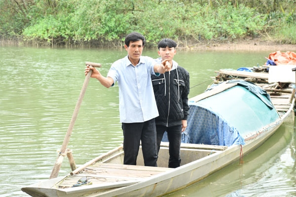 Anh Cao Hữu Tình và cháu Cao Hoàng Ân Đức trên chiếc thuyền là phương tiện cứu sống 3 nạn nhân ngày mồng 3 Tết Bính Ngọ 2026.