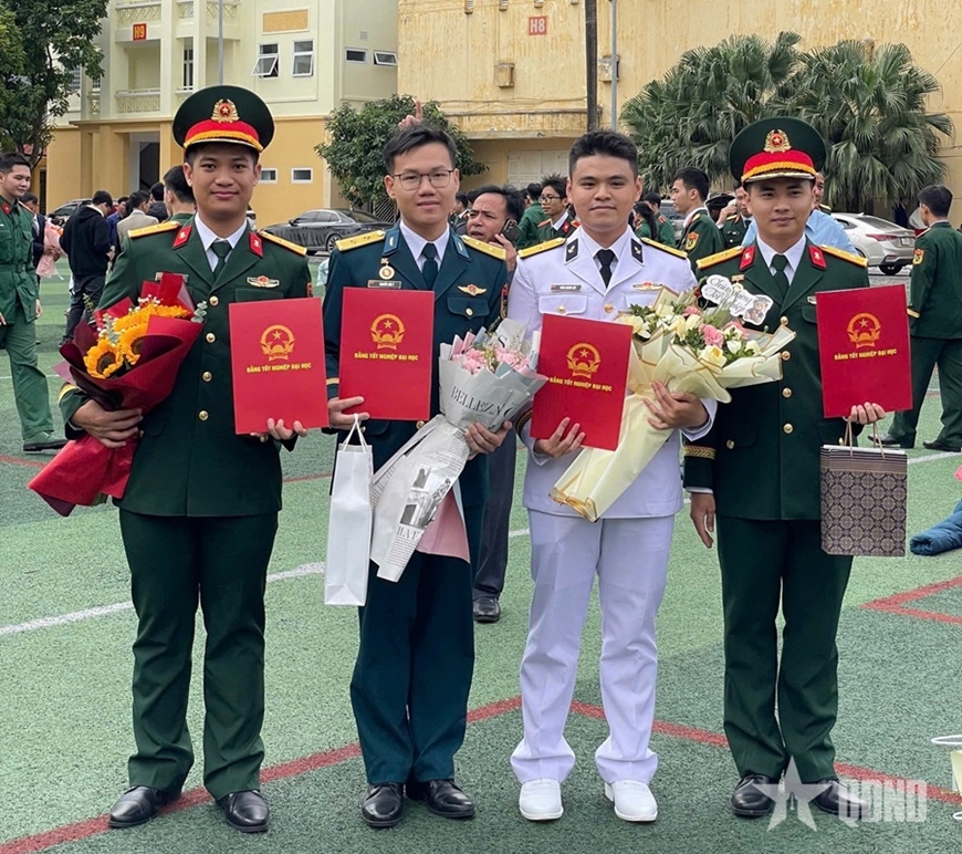 | Năm 2025, Anh Tuấn (ngoài cùng, bên trái) tốt nghiệp Học viện Kỹ thuật Quân sự. |