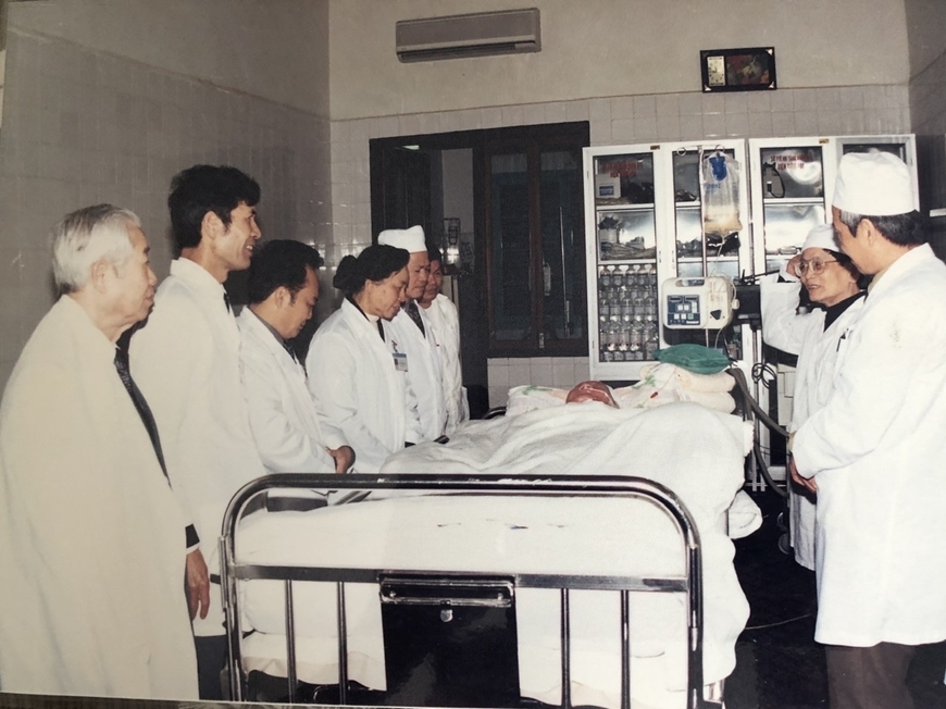| PGS, TS Nguyễn Kim Nữ Hiếu (đứng thứ tư, từ trái sang) cùng các bác sĩ của Bệnh viện Trung ương Quân đội 108 thăm khám bệnh nhân, năm 1999. Ảnh do nhân vật cung cấp |