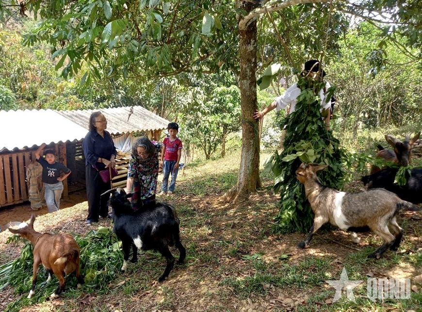 | PGS, TS Nguyễn Kim Nữ Hiếu (chống gậy) cùng các thành viên trong nhóm “Nữ trí thức-Bạn của bạn” hướng dẫn các hộ dân nuôi dê ở xã Lóng Sập, tỉnh Sơn La. Ảnh nhóm “Nữ trí thức-Bạn của bạn” cung cấp |