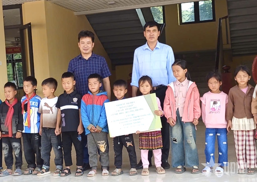| Thầy và trò Trường Phổ thông Dân tộc bán trú Tiểu học và THCS Lóng Sập (xã Lóng Sập, tỉnh Sơn La) nhận quà hỗ trợ từ nhóm “Nữ trí thức-Bạn của bạn”. Ảnh: QUANG BÌNH |