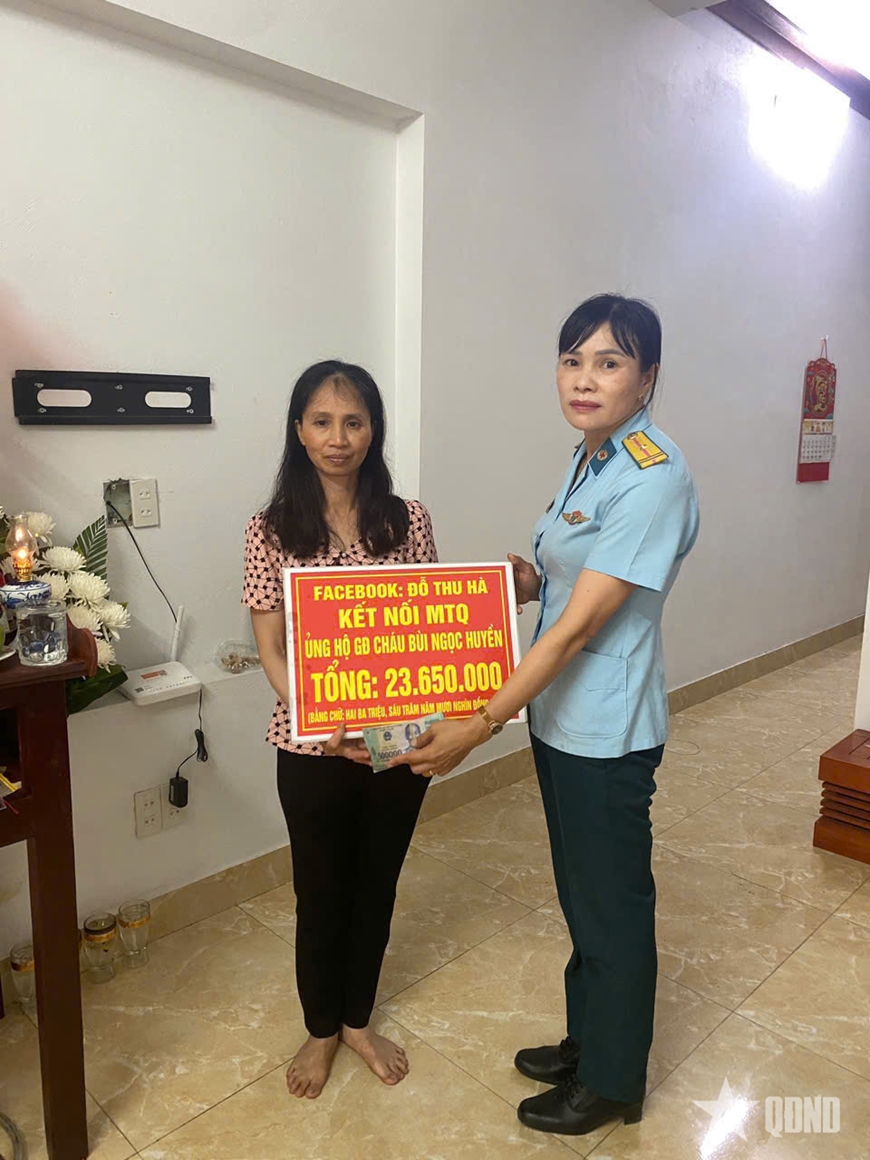 Không chỉ tích cực tham gia các hoạt động chung với CLB, Thiếu tá QNCN Đỗ Thị Thu Hà còn tự đứng ra vận động, quyên góp để ủng hộ các trường hợp có hoàn cảnh khó khăn. Đầu tiên, chị lựa chọn các trường hợp trong đơn vị công tác và nơi mình sinh sống. Chị tâm niệm: “Mình đi làm thiện nguyện nhiều nơi rồi, cũng dành thời gian giúp đỡ trong đơn vị và chính nơi đang sinh sống”. Thế là chị chủ động tìm hiểu, kết nối các mối quan hệ. Chị đã vận động, hỗ trợ cháu Nguyễn Thành Trung, sinh năm 2008, là con Trung tá Nguyễn Văn Hinh, Trợ lý Phòng Hậu cần - Kỹ thuật, Sư đoàn 363, bị mắc bệnh hiểm nghèo; tổ chức phát động cán bộ, hội viên, các nhà hảo tâm quyên góp, ủng hộ, giúp đỡ cháu Nguyễn Minh Hoàng, là con Thiếu tá Nguyễn Dũng Anh, Trợ lý xăng dầu, Phòng Hậu cần - Kỹ thuật, Sư đoàn 363, bị bệnh não úng thủy; ủng hộ gia đình chị Đinh Thị Nhiên, trú tại thôn Kim Đới 1, xã Kiến Thụy, TP Hải Phòng, có chồng bị tai nạn lao động mất khả năng lao động với số tiền hàng trăm triệu đồng…