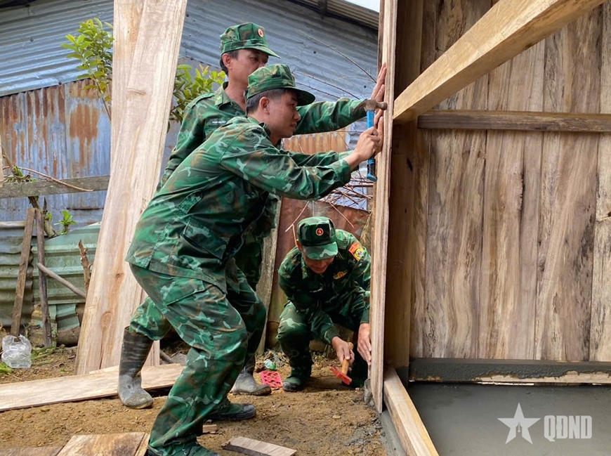 | Trung tá Nguyễn Phúc Trường (ngoài cùng, phía trước) tham gia sửa nhà cho gia đình bà Pơ loong Thị Zơơnh. |