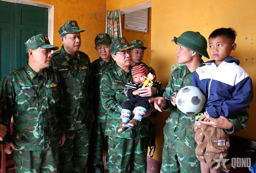| Thiếu tướng Võ Tiến Nghị, Phó tư lệnh Bộ đội Biên phòng thăm, động viên hai con nuôi của Đồn Biên phòng Ga Ry. |