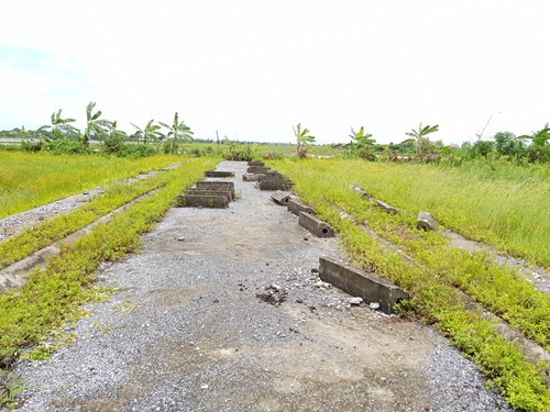Được biết, cách nơi ở của 414 hộ dân bãi sông Ninh Cơ không xa là khu vực tái định cư được xây dựng dang dở và đang bị bỏ hoang. Khu vực này rộng khoảng 50.000m2, trước đây là đất nông nghiệp của các hộ dân. Trong quá trình thực hiện dự án, UBND huyện Trực Ninh đã chỉ định thầu, giao cho Công ty Cổ phần Đại Cát Thành xây dựng hạ tầng để làm khu tái định cư. Sau khi giải ngân được khoảng 42 tỷ đồng, trong đó có 29,3 tỷ đồng tiền xây lắp, thì dự án đột ngột dừng lại và bỏ hoang nhiều năm nay. Theo quan sát của chúng tôi, dự án đã hoàn thành một số hạng mục như: Đổ cát san nền, làm hệ thống cống thoát nước, đường giao thông dẫn vào khu tái định cư... Tuy nhiên, đến thời điểm hiện tại, hệ thống cống thoát nước của khu tái định cư có nhiều đoạn bị nứt, vỡ. Con đường dẫn vào khu tái định cư mặc dù đã được xây kè nhưng rồi lại phải đóng cọc tre để bảo vệ kè. Khu đất rộng để cỏ mọc um tùm trở thành bãi chăn bò, một phần đất được người dân sử dụng làm ruộng trồng lạc.