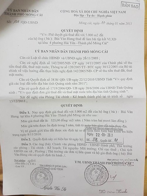 Ngày 17-1-2011, ông Vũ Văn Kinh, Phó chủ tịch UBND TP Móng Cái (nay là Phó bí thư Thành ủy, Chủ tịch HĐND TP Móng Cái) đã ra quyết định cho ông Bùi Văn Hưng (trú tại khu 5, phường Hải Hòa, TP Móng Cái), thuê 5.000m2 đất bãi triều tại khu 4, phường Hải Yên, TP Móng Cái để làm bãi tập kết vật liệu xây dựng.