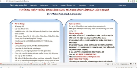 QĐND - Thời gian gần đây, thông tin tuyển dụng nhân viên nhập dữ liệu tại nhà với mức lương cao xuất hiện nhiều trên mạng xã hội. Tưởng chừng công việc gõ mã ký tự đơn giản, không ít người đã ký hợp đồng, nộp tiền lệ phí "xin việc" để rồi... lương chẳng có, lệ phí cũng mất theo. Vụ việc liên quan tới Công ty TNHH Thế giới online (Hà Nội) dưới đây là một ví dụ mang tính cảnh báo...