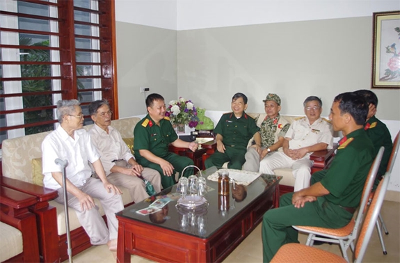 Đại tá, nhà báo Đậu Kỷ Luật (ngoài cùng bên trái) trao đổi kinh nghiệm với cán bộ phóng viên, nguyên phóng viên Báo Quân khu 4.
