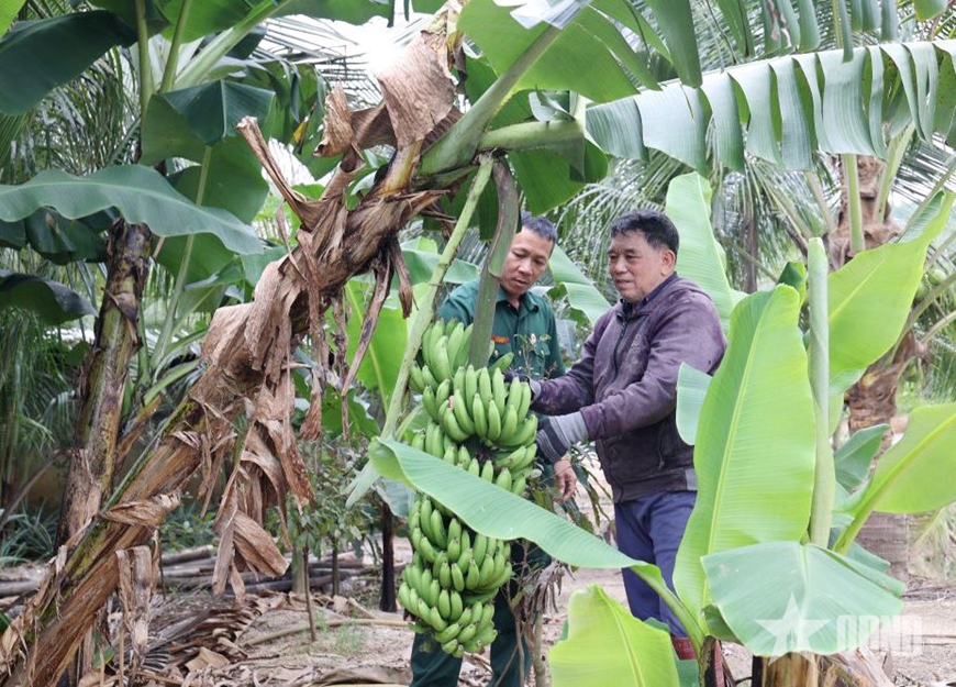 | Đồng chí Lê Văn Tự, Chủ tịch Hội CCB xã Suối Dầu và CCB Lê Quang Dưỡng bên cây chuối tiêu trĩu quả. |