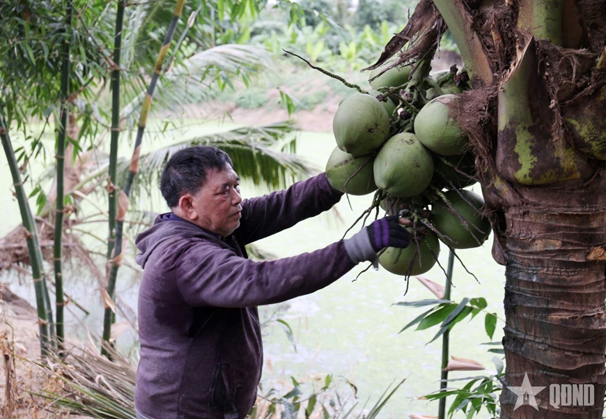 Dưới bàn tay chăm sóc tỉ mỉ của người lính già, màu xanh của cây trái đã phủ kín 6ha đất. Hệ sinh thái của đồng chí đa dạng đến kinh ngạc với 1.200 gốc dừa, 400 cây mít đang kỳ cho quả, cùng 3.000 cây dứa và 600 gốc măng tre tứ quý trồng xen canh với 1.000 cây chuối. Không dừng lại ở đó, đồng chí còn thiết kế hệ thống ao nuôi cá để vừa cải thiện bữa ăn, vừa tăng thêm thu nhập cho gia đình. Chỉ tính riêng từ cây trồng, mỗi năm đồng chí thu về thêm hơn 80 triệu đồng.