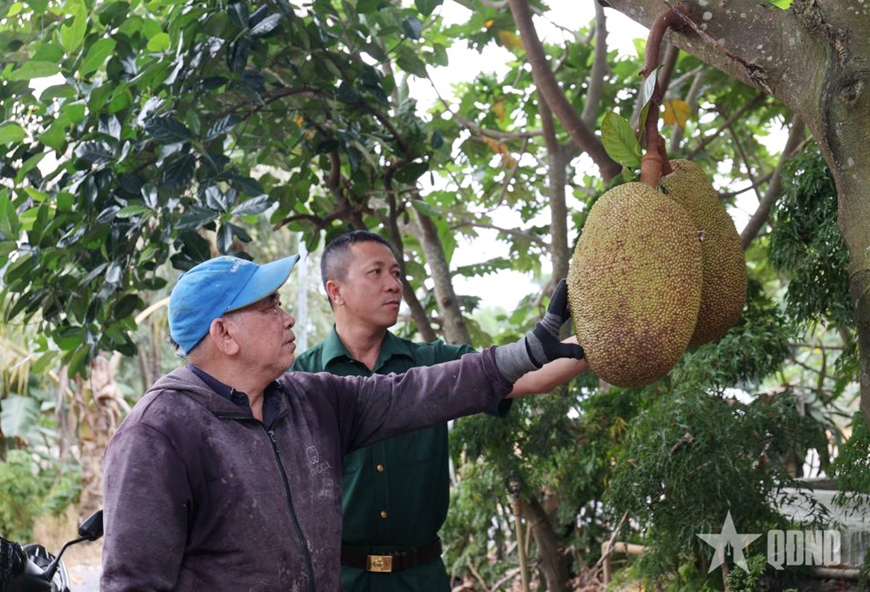 | Đồng chí Lê Văn Tự, Chủ tịch Hội CCB xã Suối Dầu và CCB Lê Quang Dưỡng bên cây mít đang cho quả. |