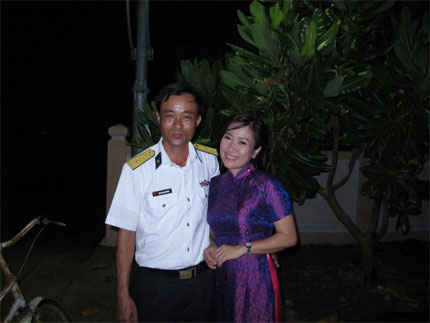 Trung úy QNCN Ngô Quang Đông vui khi được dịp trò chuyện, chụp hình với NSƯT Vân Khánh trên đảo Trường Sa Lớn.