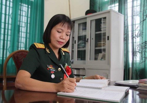 Thiếu tá Phan Thị Kim Dung chuẩn bị nội dung trước khi phát biểu tại Đại hội Thi đua Quyết thắng của Trường Cao đẳng Công nghệ và Kỹ thuật ô tô.