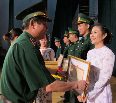 Chị Nguyễn Thị Minh Châu tại lễ tuyên dương điển hình tiên tiến học tập và làm theo tấm gương đạo đức Hồ Chí Minh năm 2013 của BĐBP.