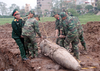 | Cán bộ, chiến sĩ Tiểu đoàn Công binh 544, Bộ tư lệnh Thủ đô Hà Nội xử lý bom tại xã Châu Can, Phú Xuyên (Hà Nội) tháng 12-2012. Ảnh: Văn Đạt |
