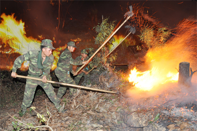 | Cán bộ, chiến sĩ Bộ tư lệnh Thủ đô Hà Nội phối hợp với các lực lượng trên địa bàn chống cháy rừng tại Sóc Sơn (Hà Nội) tháng 3-2013. Ảnh: Hoàng Hải |