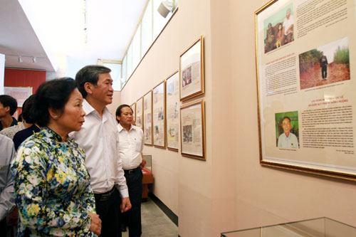 Các đại biểu tham quan triển lãm "Học tập và làm theo tấm gương đạo đức Hồ Chí Minh" và Chủ tịch Hồ Chí Minh với phong trào thi đua yêu nước tại Bảo tàng Hồ Chí Minh ngày 16-5-2013. Ảnh: Thu Hà