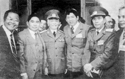 Đại tướng Võ Nguyên Giáp (giữa), các nhà văn (từ trái sang) Trần Công Tấn, Trần Hữu Tòng, Cao Tiến Lê, Lê Lựu, Nguyễn Văn Dinh... tại Đại hội Nhà văn Việt Nam lần thứ 5. Ảnh: TL.