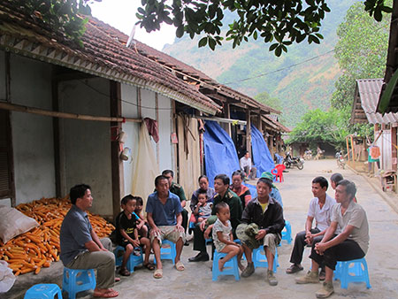 | Giàng Chúng, Trưởng thôn Cốc Phương, xã Bản Lầu (ngoài cùng bên trái), luôn gương mẫu đi đầu trong các công việc của thôn cũng như phát triển kinh tế gia đình. |