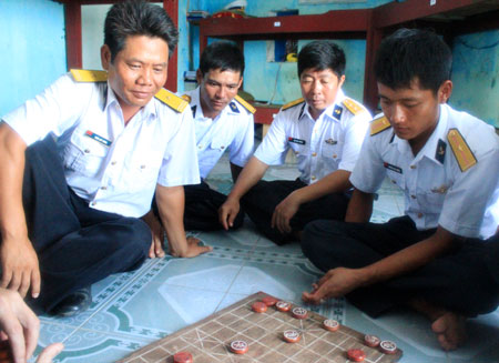 Cán bộ, chiến sĩ đảo Đá Nam vui bên bàn cờ trong giờ nghỉ như anh em trong gia đình