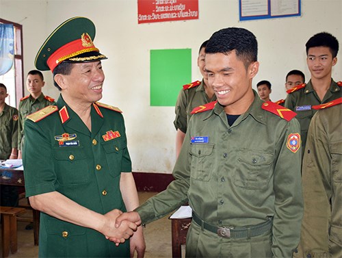 Thiếu tướng Phạm Văn Huấn, Bí thư Đảng ủy, Tổng biên tập Báo QĐND hỏi thăm học viên Trường Hạ sĩ quan 2 Viêng Xay.