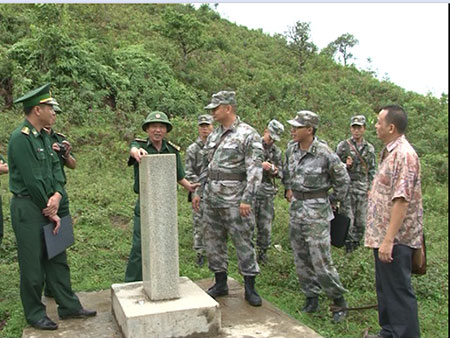 | Công tác phối hợp tuần tra giữa Bộ đội Biên phòng 2 nước cũng là dịp để hướng dẫn nhân dân 2 bên nhận biết vị trí đường biên ngay tại thực địa. |